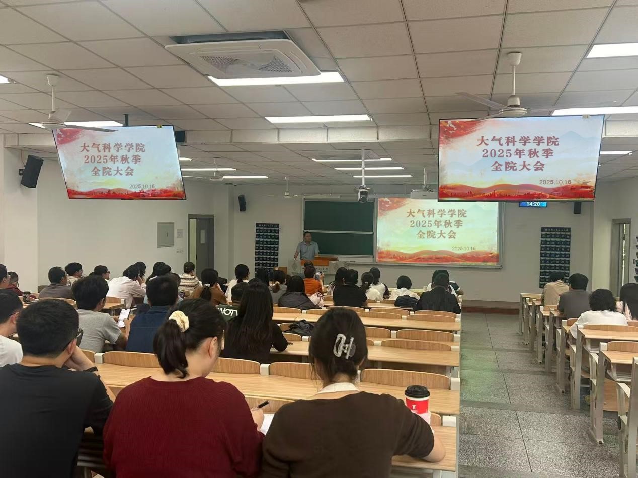 2025年10月16日下午,大气科学学院2025年秋季学期期中全体教职工大会在教学楼1202召开,会议由学院党委书记张宇主持,学院全体教职工参加此次会议。